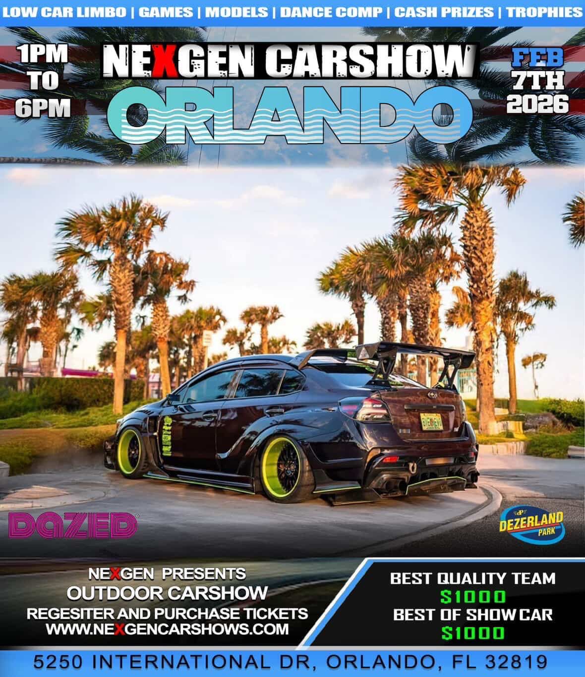 | Ticket Type | Nexgen Car Show Orlando Florida – VIP judged, Nexgen Orlando Florida – General Car Show Judged, Nexgen Orlando Florida – Spectators |