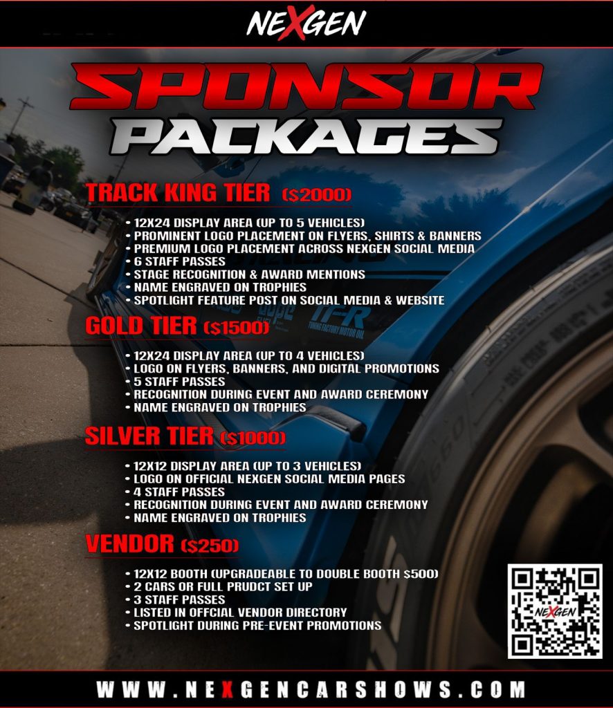 Vendor registration Form Please enable JavaScript in your browser to complete this form.Please enable JavaScript in your browser to complete this form.Vendor, Sponsor or Title Sponsor * Please Select the event your are applying to register for: *Choose OptionNEXGEN BRONZE VENDOR PACKAGE – $250NEXGEN SILVER (DOUBLE BOOTH) VENDOR PACKAGE – $500NEXGEN GOLD SPONSOR PACKAGE – $1000NEXGEN TRACK KING SPONSOR PACKAGE – $2000NEXGEN PLATINUM SPONSOR PACKAGE – $1500Which show would you like to register for? *Choose Option1. NexGen Carshow: Import vs Domestic Houston2. Nexgen Dome Show Connecticut3. Nexgen Car Show Syracuse NY4. Nexgen trunk or treat Car Show CT5. Nexgen- Orlando Florida Car Show6. Nexgen Car Show Rhode Island7. Nexgen Car Show JDM vs EURUBusiness Name *Business Type *Email *Phone Number *Instagram *Booth SizeIf Larger Than 10x20 Please List Here Phone PROMOTIONAL for: IF YOU HAVE A BUSINESS LOGO, BOOTH IMAGES OR DISPLAY CAR PICTURES PLEASE SUBMIT BELOW SO WE CAN ADD TO PROMOTIONAL MATERIAL FOR YOU TO POST: Click or drag a file to this area to upload. AgreementIF YOU HAVE A BUSINESS LOGO, BOOTH IMAGES OR DISPLAY CAR PICTURES PLEASE SUBMIT BELOW SO WE CAN ADD TO PROMOTIONAL MATERIAL FOR YOU TO POST:Register Vendor, Sponsor or Title Sponsor * Please Select the event your are applying to register for: NEXGEN BRONZE VENDOR PACKAGE – $250 NEXGEN SILVER (DOUBLE BOOTH) VENDOR PACKAGE – $500 NEXGEN GOLD SPONSOR PACKAGE – $1000 NEXGEN PLATINUM SPONSOR PACKAGE – $1500 Which show would you like to register for? 1. Nexgen Dome Show 3.0 Connecticut - INDOOR 2. Nexgen Dome Show 3.0 Connecticut - OUTDOOR 3. Nexgen PA Mall Meet - INDOOR Ticket 4. Nexgen Massachusetts Cars & Smoke 5. Nexgen Houston Texas - INDOOR 6. Nexgen Houston Texas - OUTDOOR 7. Nexgen Maryland Showdown 8. Nexgen Friendly Acura meet 9. Nexgen Dome Show Season Closer 10. Nexgen Trunk or Treat Car Show Business Name Business Type Email Number Instagram Booth Size If Larger Than 10x20 Please List Here IF YOU HAVE A BUSINESS LOGO, BOOTH IMAGES OR DISPLAY CAR PICTURES PLEASE SUBMIT BELOW SO WE CAN ADD TO PROMOTIONAL MATERIAL FOR YOU TO POST: Agreement I understand that if i do not complete THIS FORM i will not be able to Register my Business, Sponsorship or Vendor. REGISTER Vendors Add to cart Vendor PLATINUM SPONSOR PACKAGE – $1500Rated 0 out of 5 $1,500.00 Add to cart Add to cart Vendor GOLD SPONSOR PACKAGE – $1000Rated 0 out of 5 $1,000.00 Add to cart Add to cart Vendor SILVER (DOUBLE BOOTH) VENDOR PACKAGE – $500Rated 0 out of 5 $500.00 Add to cart Add to cart Vendor BRONZE VENDOR PACKAGE – $250Rated 0 out of 5 $250.00 Add to cart